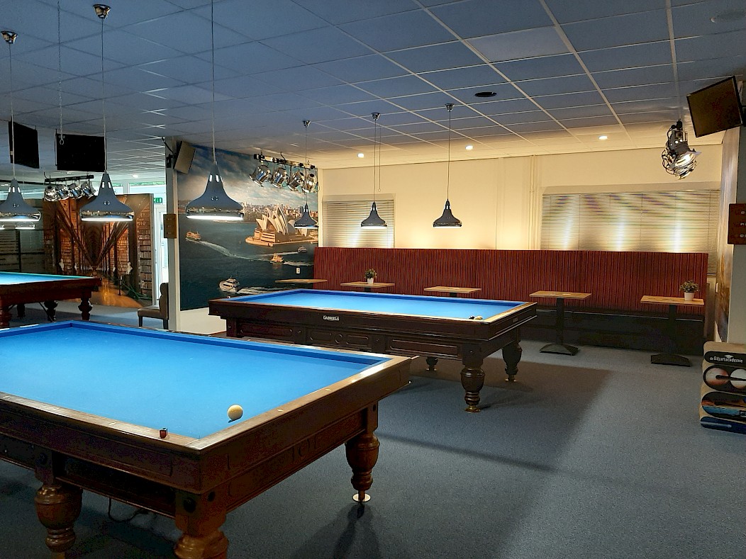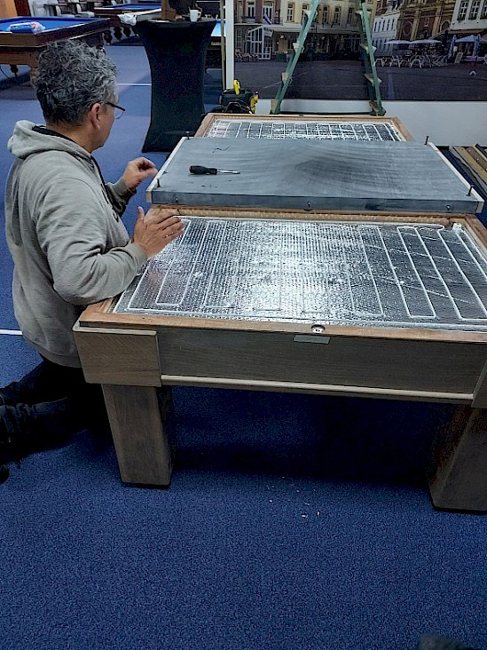 Foto's van de plaatsing van 2 nieuwe Verhoeven Biljarts door Biljarthandel de Biljartacademie.